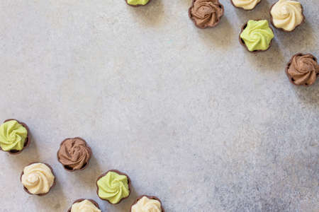 Yummy Assortment chocolate candies. Chocolate with vanilla, chocolate and pistachio cream on marble background. Top view flat lay background. Copy space.