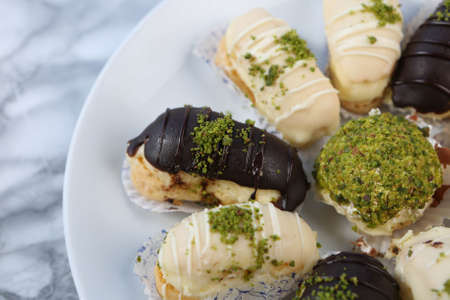 Set of delicious dessert eclairs with colorful topping