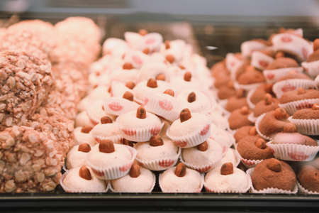 Different sweet cakes in bakery cafe close up. Confectionery cakes in candy shop