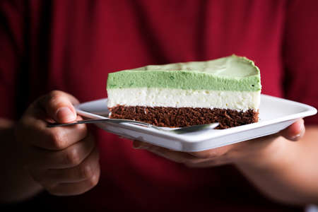 A piece of matcha/green tea, coconut powder, and chocolate cake in a closeup view.