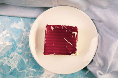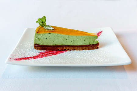 Delicious dessert, A square piece of cheesecake, that filled with mango cream, placed on white plate and decorated with chocolate and strawberry jam.