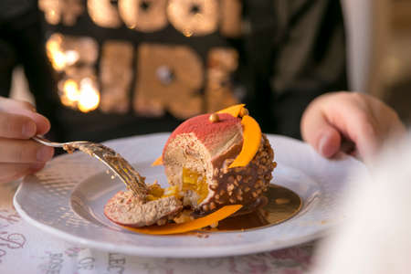 Customer eating creamy orange dessert serving on square cut plate in restaurant. Delicious cake decorated by dried citrus, cherry and mint, close up picture