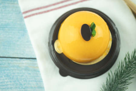 Jelly mousse cake covered with orange glaze. Sweet decorated of green leaf.