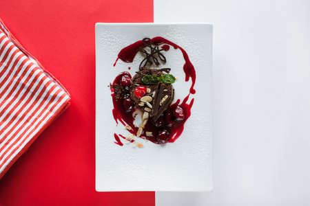 Chocolate cake on colorful background of red and white. Delicious dessert serving in restaurant with decoration from cherry, almond and mint, top view with free space