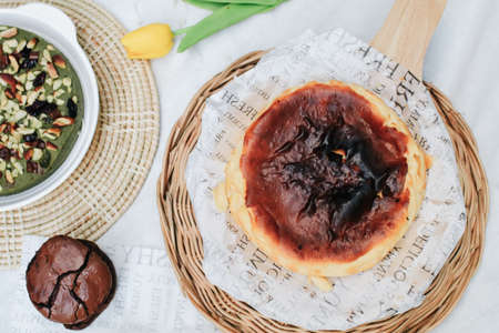 Basque burnt cheesecake with sweetened cream cheese and eggs and cream baked in a crumb crust. A tray of homemade cheesecake on table