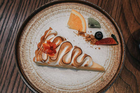 Lemon tart with meringue pie. Traditional french sweet pastry tart. Delicious, appetizing, homemade dessert with lemon curd cream.