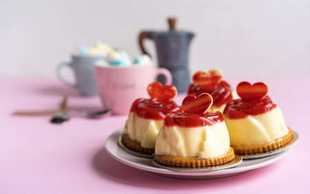 Bavarian cream pastry with strawberry jelly, two cups and caffe pot