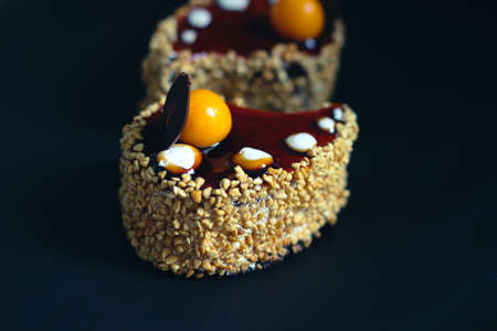Chocolate cake caramel with cherry and fruit on white plate / Close up cake slice