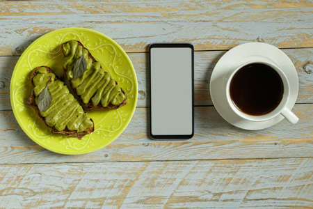 Avocado pasta with green basil, garlic and coconut cream on whole grain bread on a faience green plate next to a smartphone and a cup of coffee on a table made of stained shabby boards
