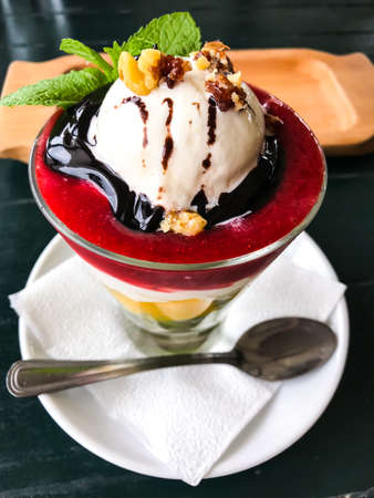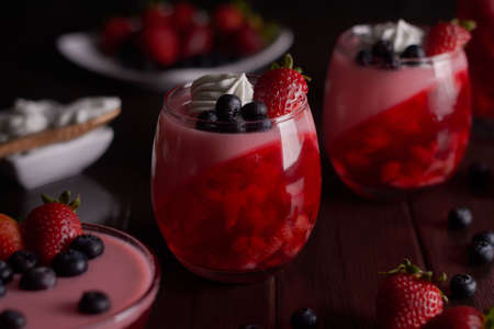 Red fruit jelly desserts chantilly cream and blueberries and strawberries in glass cup on brown wooden background