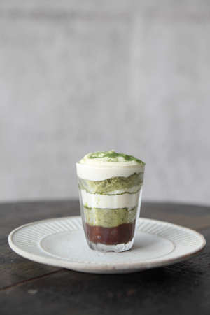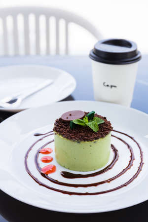 Matcha green tea and red bean mousse cake on white plate with cup of coffee
