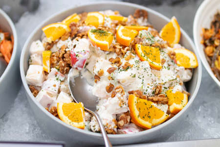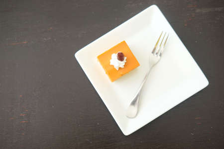 Mixed fruit cake, orange flavor cake. space for text, top view