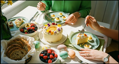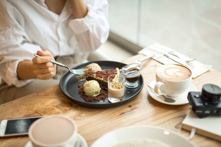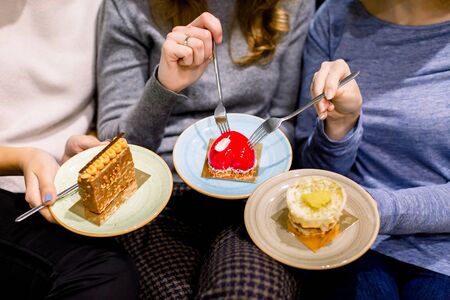Drinking coffee and eating desserts together. Top view of hands of three beautiful women holding plates with delicious cakes desserts in cafe. Meeting of best friends. Coffee with cakes