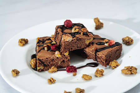 Chocolate brownie squares with walnut pieces, chocolate threads and granola. Natural, healthy food concept. High view.