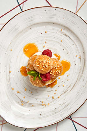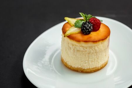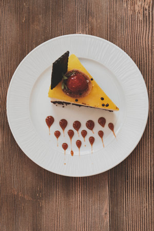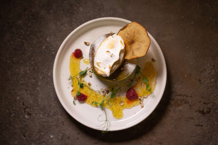 Luxury restaurant dessert top view. Decorated caramel cheesecake with raspberry on white craft plate. Delicate fancy sweet course. Delicious Greek cream tart close up. Art of confectionery