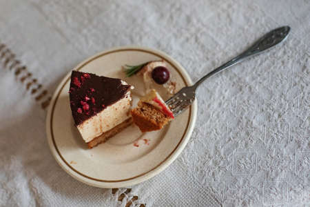 A piece of sliced apple pie. Composition with pieces of delicious pie on textured background. Piece of raspberries cake on plate isolated. Plate with delicious chocolate cake on background.