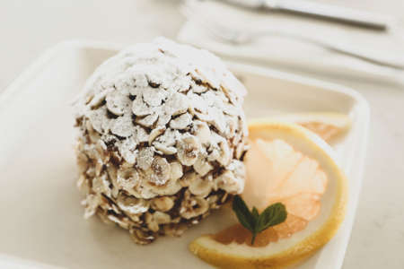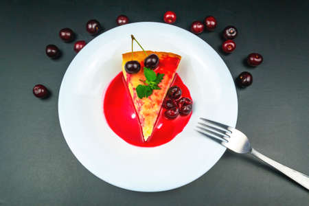 Light breakfast. A piece of casserole on a white plate is decorated with mint and crushed cherries. Blue background