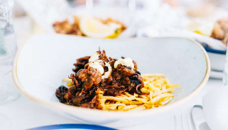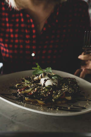Delicious appetizer served on an elegant white plate in a restaurant.