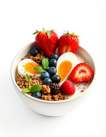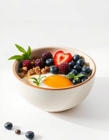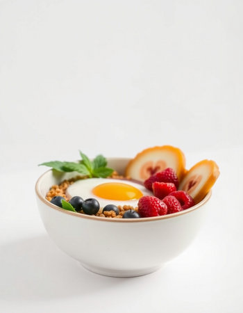 Healthy breakfast bowl with oatmeal, berries and egg on white background