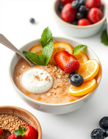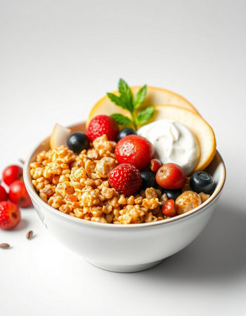 Healthy breakfast bowl with yogurt, berries and granola on white background
