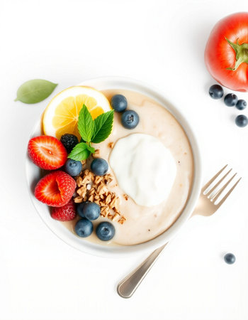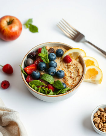 Healthy breakfast bowl with oatmeal, berries and nuts on white background