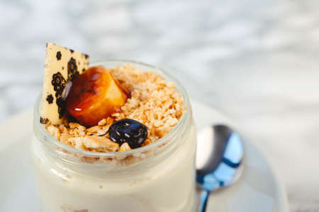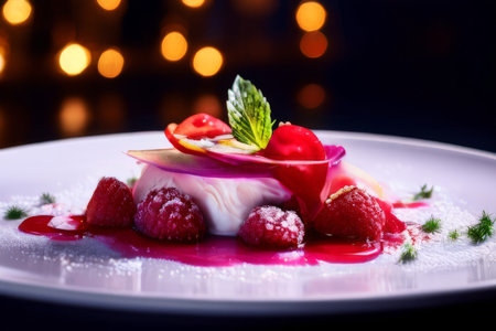 Close up photography of a fancy panna cotta with strawberries. Shallow dof