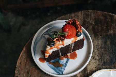 Dark beer chocolate cake on white plate and decorated with strawberries, blueberries and pistachio on wooden table.