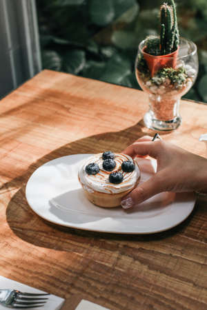Hand pick up Lemon meringue and blueberry tart in white plate on wooden table. Pie Dessert. Horizontal Copy space