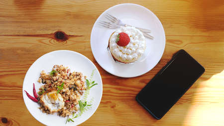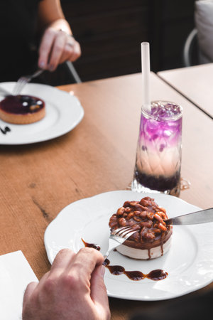 Close-up on woman hands taking photo of a dessert. Food photography with smart phone. Social media photography. Generative AI.