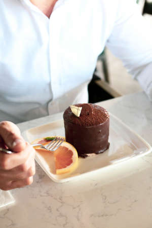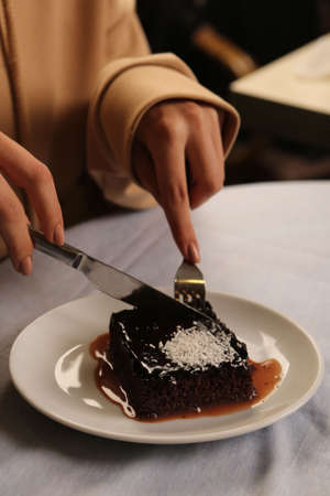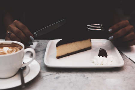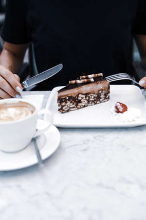 Hands taking chocolate cake with spoon and small cup coffee on dark table.