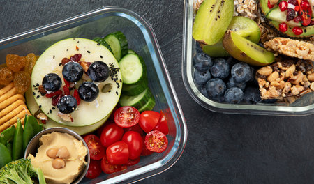 Lunchboxes with various healthy nutritious meals. Concept of healthy snacks in boxes on a dark background. Top view.