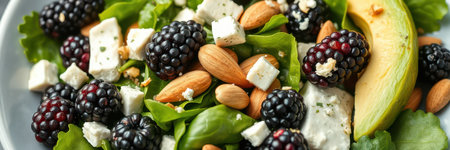 Fresh salad with blackberries, feta cheese, almonds, and avocado on a blue plate