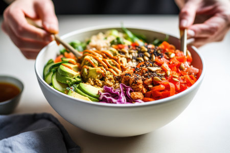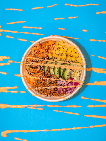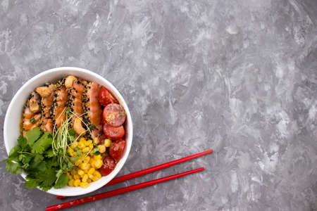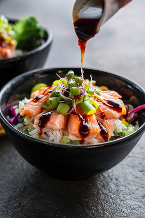 Poke bowl with salmon and vegetables, green onions and microgreens with soy souce pouring over