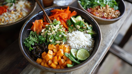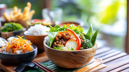 A beautifully arranged selection of Asian dishes showcases vibrant colors and fresh ingredients. This rustic table setting invites a warm dining experience.