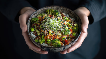 A close-up captures a bowl filled with various vegetables and grains, presented by two hands. The food displays a mix of greens and other colorful ingredients. The composition, lit by natural lighting, suggests a focus on freshness and health. Suitable for culinary, health, or lifestyle-related applications.