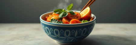 A mouthwatering bowl of Kaeng Som, Thai sour curry with fish, pineapple, tomatoes, and herbs, offering a perfect balance of tangy and spicy flavors.