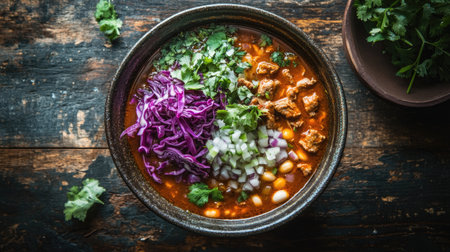 A vibrant bowl of spicy chicken soup garnished with fresh cilantro, red cabbage, and diced onions, perfect for a comforting meal.