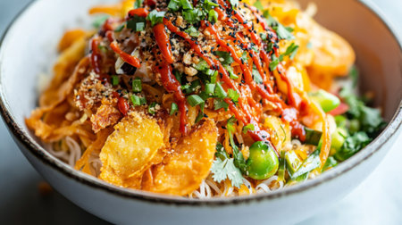 This vibrant rice noodle bowl showcases a delicious combination of fresh herbs, crunchy chips, and a spicy sauce, creating a perfect culinary delight.