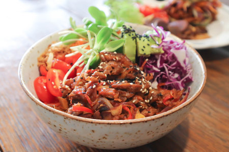 Beef Donburi Japanese rice, topped with yakiniku beef and egg serve in the table.