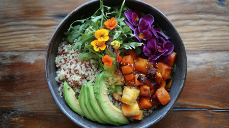 A colorful quinoa bowl with avocado, sweet potato, and edible flowers