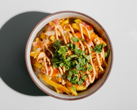 Fried vegetables with ham and cheese and potatoes in a bowl on gray background