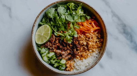 A vibrant bowl of noodles featuring fresh vegetables, herbs, and garnishes. Perfect for showcasing colorful ingredients and culinary art.