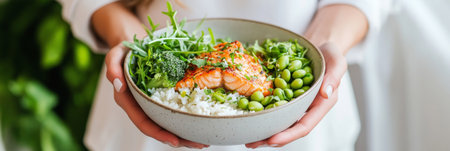 A nutritious breakfast bowl features fluffy rice topped with tender salmon chunks and accompanied by vibrant broccoli, edamame, and leafy greens for a balanced meal, banner