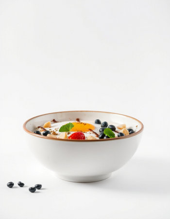 Healthy breakfast with oatmeal, fresh berries and egg on white background