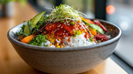 Cozy restaurant features a highdetail neutralcolored poke bowl with warm lighting and a closeup view for a realistic feel. Nobody present. Generative AI Generated