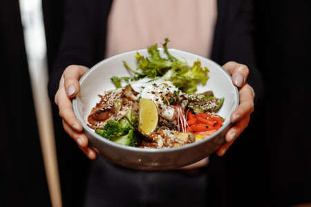Woman having healthy vegetarian poke bowl with vegetables and quinoa and iced matcha latte on lunch at vegan cafe or restaurant