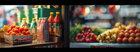 An assortment of fresh produce like tomatoes and bottled beverages displayed at a local market, with a focus on healthy, organic food and vibrant colors.