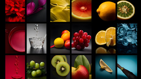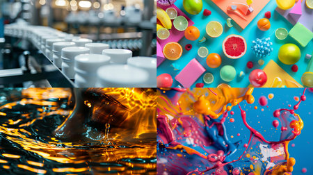 A dynamic collage featuring industrial production lines, colorful fruits, liquid art, and vibrant paint splashes, capturing diverse themes and creative concepts.