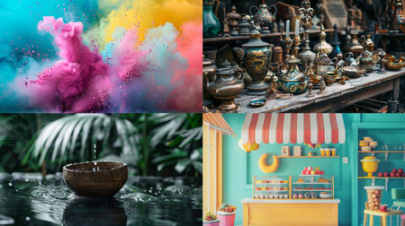 A vibrant collage including clouds of colored powder, antique market items, tropical water droplets, and a bright bakery interior. Perfect for diverse lifestyle and creative themes.