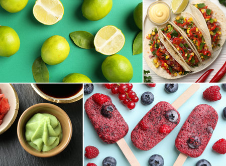 collage of photos of food and drinks of vegetables, fruits, dishes, cocktails, fish, ice cream in the form of a panorama
